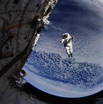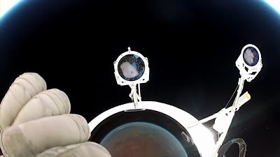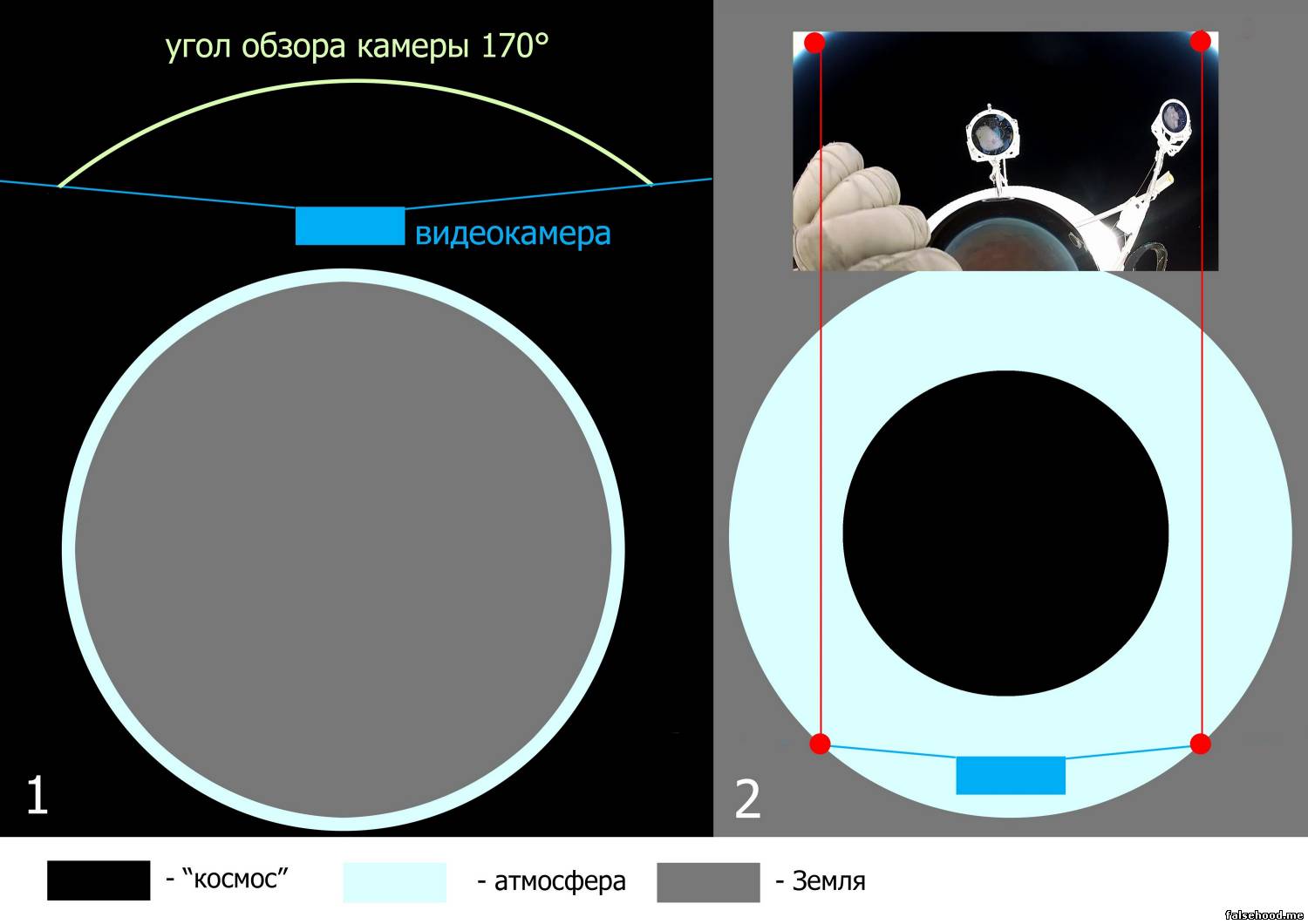 Камера на скафандре снимает шлем и видеокамеры над ним. Камера широкоугольная с охватом 170 градусов.На левой половине картинки видно, что при положительной кривизне Земли атмосфера