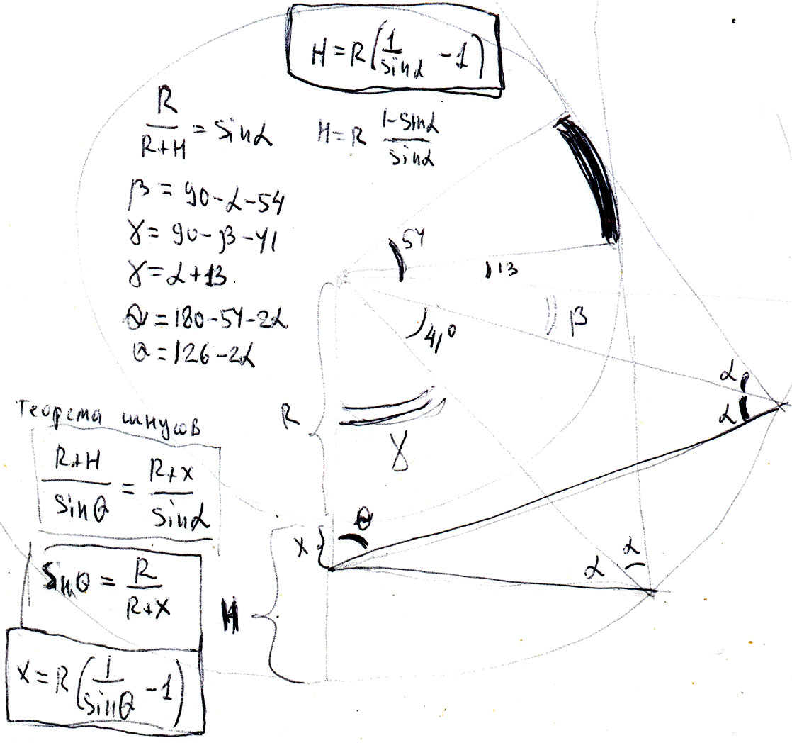 прохождения сигнала вызвано более длинной траекторией сигнала. R - радиус Земли H - толщина оболочки X - глубина землетрясения Зона тени расположена от 13 до 54 градусов над горизонталью. Мы получили два одинаковых соотношения для величин Н и Х. И можем их проанализировать. Понятно, что Х не может быть больше Н, а потому угол альфа не может быть больше