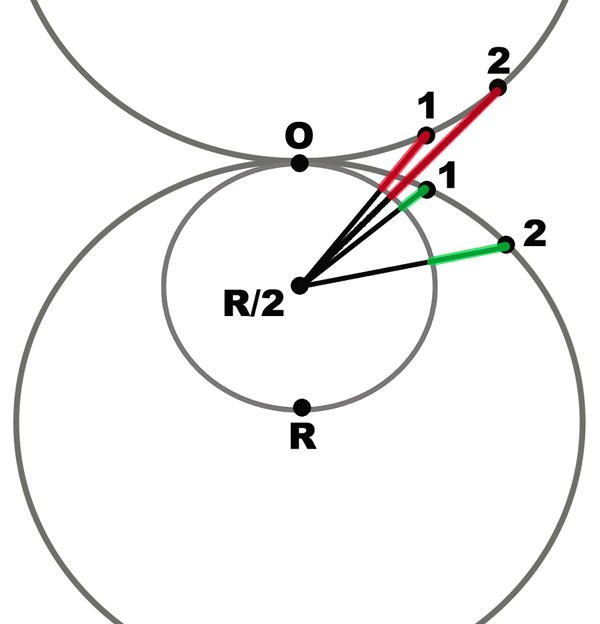 выгнутая реальная поверхность. От эпицентра расходится сфера сейсмоволны. На поверхности три сейсмостанции. 0 - над эпицентром. На станции 1 и 2 волна приходит с задержкой. Зеленые отрезки пропорциональны длине задержки в ОМ. Далее просто триангуляцией определяем эпицентр. Но! Реально измеренные задержки не зеленые, а красные (в ФМ). Проводим красные прямые из "официальных" 1 и 2 (упрощенно, подсчет более сложный, так как в уравнениях к задержкам должна быть добавлена неизвестная глубина). Где они пересекутся на линии 0R? Где-то неглубоко под 0. Вот и ответ. А почему происходят разночтения? Метеостанций много. И когда начинают вычислять глубину по совокупности (методом наименьших квадратов), то результат будет какой угодно (просто случайный) и сильно отличаться от первичной триангуляции. Необходимо также отметить, что стабильность зоны тени говорит о том, что все эпицентры находятся на одной глубине. Иначе, как легко видеть по найденному решению, новая глубина даст новые углы отражения и новую зону. Что еще раз указывает на оболочку, как на источник сигналов. А в ОМ всё сходится тоже на одной глубине эпицентра - 0 километров! И еще один эффект, не имеющий удовлетворительного сейсмического объяснения: афтершок.