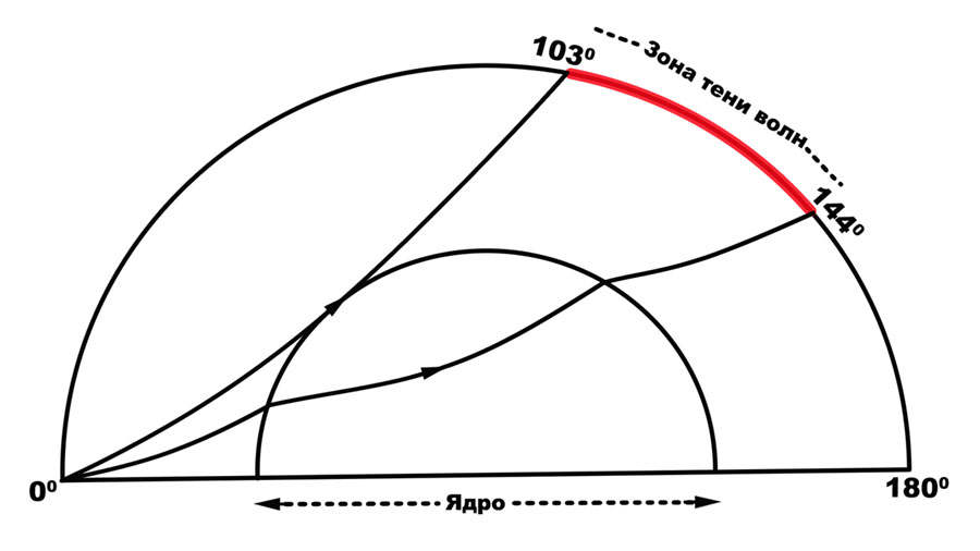 спецификой прохождения в ядре, то 103 градуса уже ничем не мотивированы. Поэтому и возникает зона тени, так как сигнал идет не по прямой на противоположную сторону земли, а огибает почти по окружности.