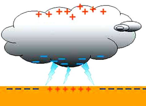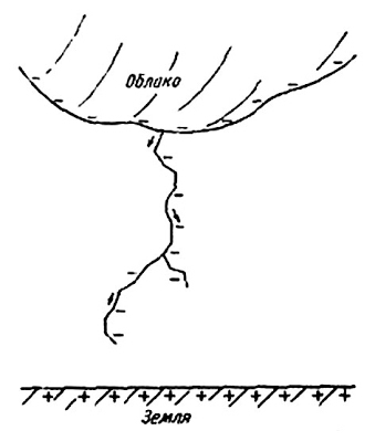 Оба-на! Электроны будут не отталкиваться, а ускоряться! А для удобства понимания почему, земля помечена плюсиками. Раз потенциал меньше, то мы можем считать его положительным!!! Блестящая логика, позволяющая объяснить всё, что угодно! Брал здесь: http://allphysics.ru/feynman/elektrichestvo-v-atmosfere Это знаменитые фейнмановские лекции! Есть и другие варианты: В этой модели отрицательная туча стягивает под себя положительные заряды на