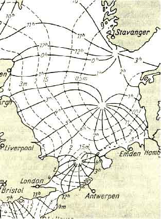 А вот и иллюстрация: Это карта котидальных линий и изоамплитуд для Северного моря, отражающая