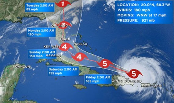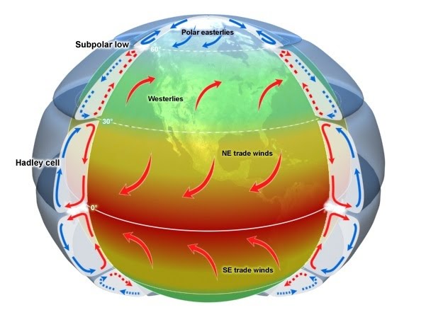 И еще один вопрос: а как же движутся эти циклоны-антициклоны? Ответ прост: как хотят, так и движутся. А чтобы хоть как-то навести науку на этот беспредел, метеорологи придумали три изолированных ячейки с разными направлениями движения: Но увы, действительность не всегда соответствует этой схеме. Ураган Ирма из середины 1-ой зоны пошел не к экватору, а на Флориду: Когда ураган Сэнди таким же манером дошел до середины 2-ой зоны, то повернул
