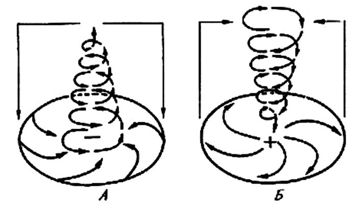 Стандартная картинка движения воздуха в циклоне (А) и антициклоне (Б) в