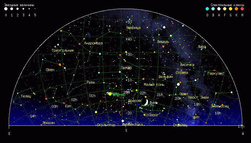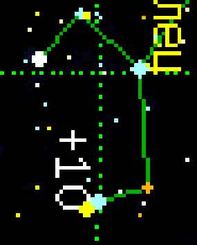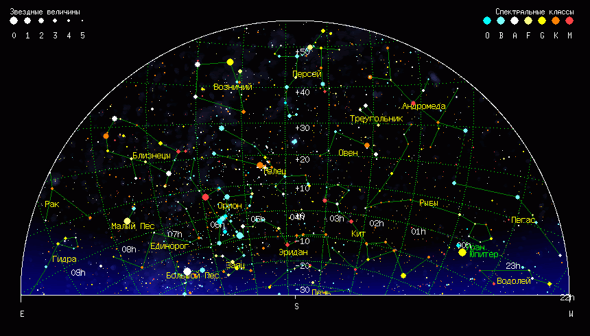 Что-ж, с водой разобрались, будем искать хрусталь. Ближайшая половина ЗС разворачивается перед нами на всё пространство в 180 градусов. Что это означает? А то, что изображения у экватора ЗС будут сильно растянуты при приближении к горизонту. У полюса же искажений не будет. На этот эффект обращали многие, любуясь звездами, и он отражен в компьютерных программах. Проверим Астронетом созвездие Тельца (крайний слева): И посмотрим на него через пять часов (в центре): Видно, что созвездие повернулось и изменило линейный размер.
