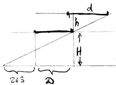 270 - диаметр тени H - высота Луны h - превышение Солнца над Луной Начало полного затмения: левые края совпадают (наблюдатель в левом углу) H/(270-D)=h/(D-d)