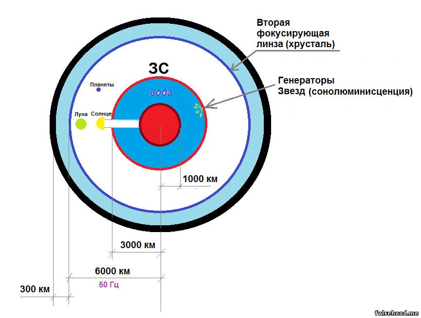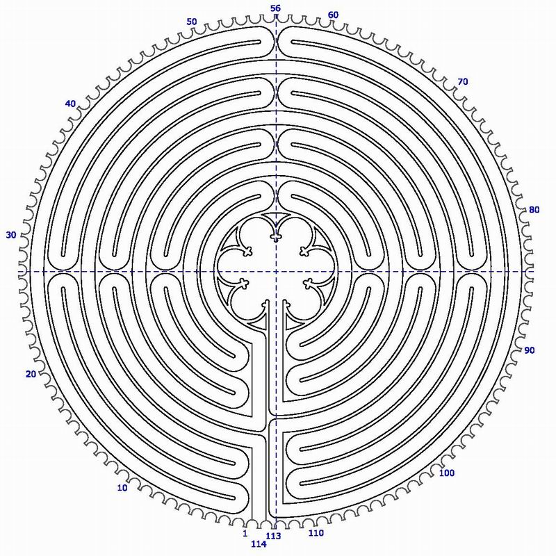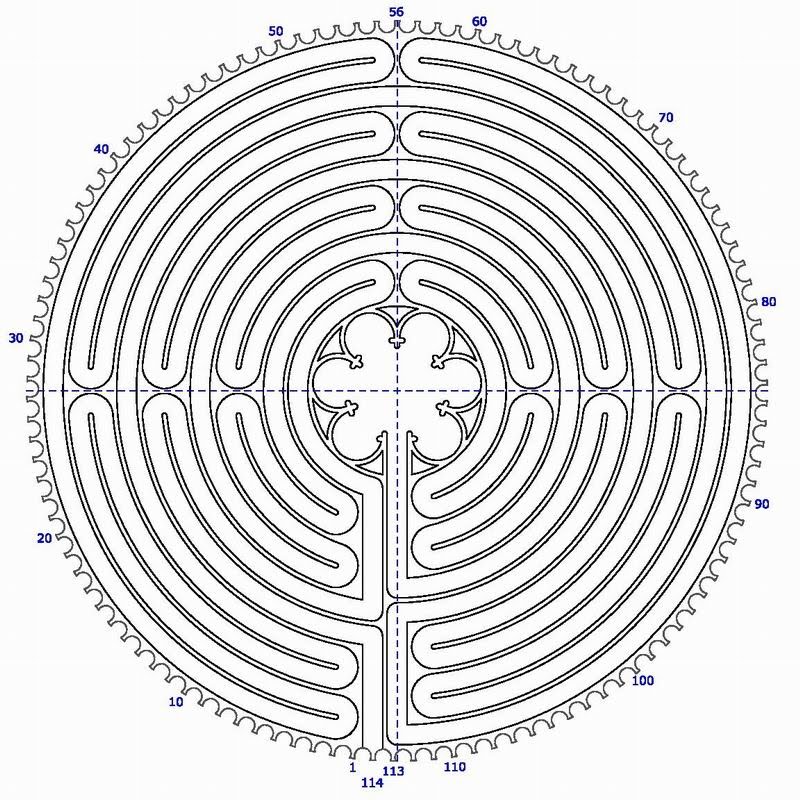 соблюдена. Центр Титана нам понятен: сфера ЦЗ в окружении слоя воды. А вот какова конструкция в промежутке от 300 км до ЗС, где смонтированы хрустальные линзы? И здесь у нас есть подсказка: "Лабиринт Розы", выложенный на полу готического собора в городе Шартр недалеко от Парижа: Вот точная схема лабиринта с одиннадцатью сферами, как и гласит космогония: Мы видим ЗС в центре. Она фиксирована вверху и внизу, причем, внизу к ней