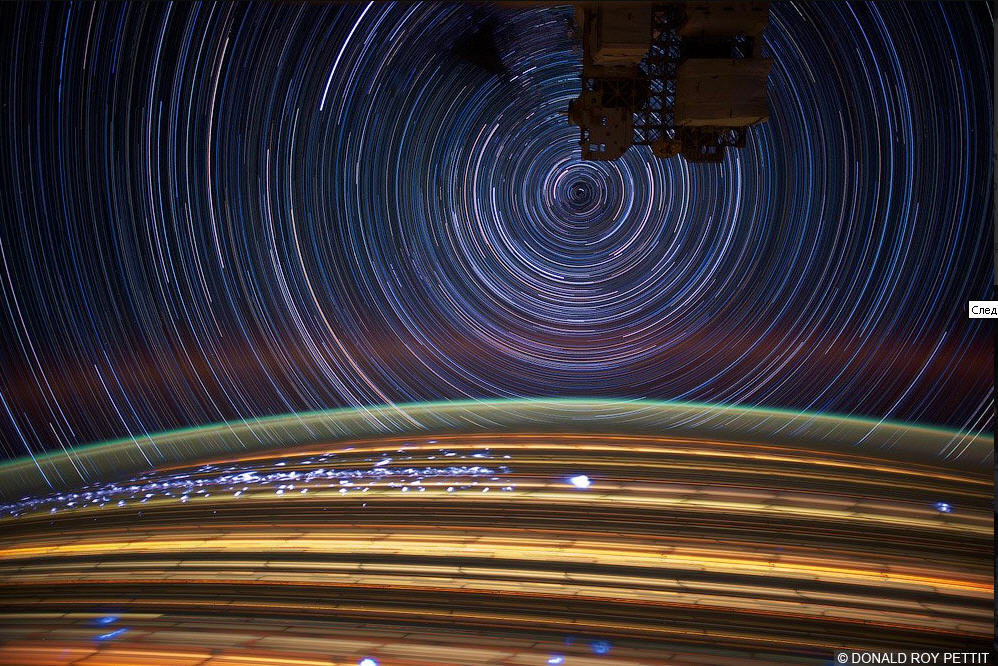 смотреть в космос, а не на Землю. Но у МКС нет никакого вращения камеры. Она летает, вращая нос. Полный аналог Луны, всё время обращенной к нам одной стороной. Но мы знаем, что Луна обеспечивает такой вид своим вращением вокруг собственной оси. А значит, МКС тоже вращается. Иначе никак. Но если МКС вращается, то на ней нет невесомости - центробежная сила создает аналог гравитации. Да, маленькой, но за десятиминутное интервью, которое часто устраивают американские товарищи, их сносило бы метров на пять от камеры. Чего не наблюдается. Да и отметили бы факт вращения, сообщив, какие двигатели его поддерживают. Вот, мы почти убедились, что съемка - реальная. Но посмотри еще на одну. Этот снимок