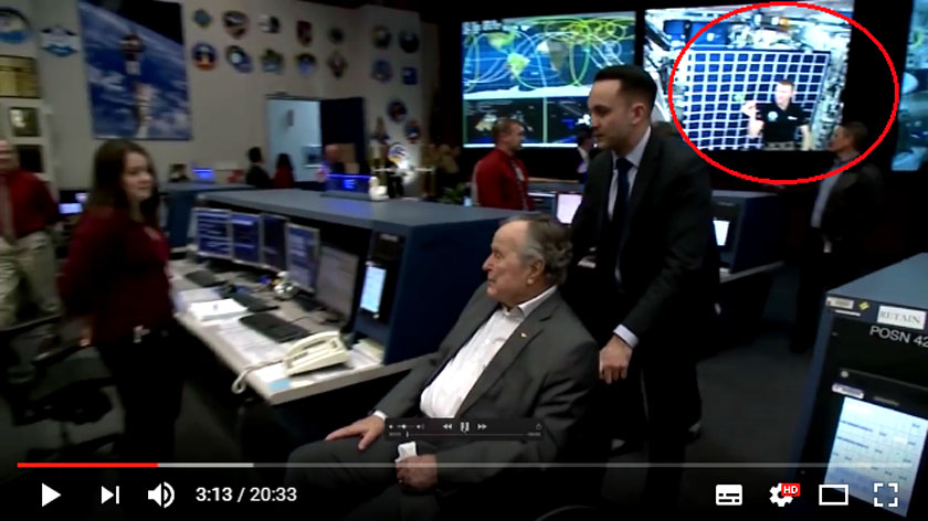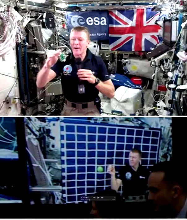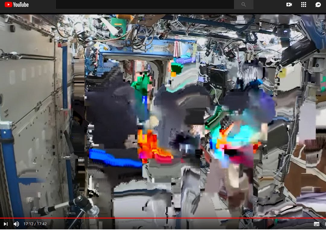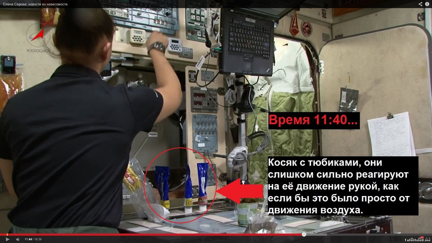 хромокея, который потом заменяют видами МКС. В кадр случайно попал экран со съемкой астронавта Тима Пика на хромокее. Может быть отмазка, что это всего лишь координатная разметка для фиксации пролёта шарика, и сработала бы, если бы не такой же хромокейный шарик перед актером вместо гироскопа прямого эфира. А вот и сбой наложения фигур на экран в конце сеанса связи: И этот длинный ролик о ляпах в трансляциях с МКС надо смотреть полностью: На задворках истории Интересно посмотреть на рассказ Елены из этого ролика из МКС: Спорно, задела ли она второй тюбик, но третий слегка