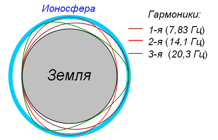 минимизации энергетических потерь. Это еще одна причина, почему выше 45 км не пускают никакие летательные аппараты. Вот модель этих стоячих волн вокруг Земли: Картинка из ОМ. Для нас синий круг - поверхность земли, а серый - Титан ("Земля"