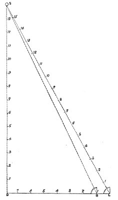 (Samuel Birley Rowbotham). Для доказательства близости Солнца был проведен эксперимент: на прямом участке от Лондонского моста до Брайтона осуществили одновременные замеры высоты Солнца в полдень - http://www.sacred-texts.com/earth/za/za23.htm. Расстояние между экспериментаторами составляло 50 статусных миль, а углы оказались в 64 и 61 градус. Казалось бы, что тут считать: написал два соотношения с двумя неизвестными через тангенсы углов и легко нашел высоту DS на рисунке. Но автор не умеет решать даже простую систему уравнений (Иванов сделал неверный вывод из арифметики Магницкого: не дробей не знали, а не умели составлять простейшие уравнения с неизвестным).Поэтому он просто точно чертит на рисунке два угла и циркулем откладывает известное расстояние в 50 миль (отрезок BL). Поместилось 14 раз? Значит, до Солнца 700 миль. 1881 год!!!