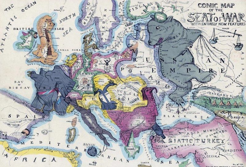 в "Южную столицу" - Москву. Так тогда назывался Севастополь. Надо было находиться рядом с театром боевых действий. Переговоры о разделе сфер влияния с турками, австрийцами, Шамилем. Чем быстрее реакция на меняющуюся обстановку, тем лучше. Интернета, увы, еще не было. Да и телеграфные линии только-только начали прокладывать. И Англия решила, что это наиболее удобный момент для переворота: открылся доступ к лакомому куску - Уральским горам. Её протеже - Шарль Луи Бонапарт - форсировал события и в 1852 объявил себя императором. Участие России в Венгерской войне послужило отличным жупелом для привлечения союзников в армию вторжения в Россию. Карикатура 1854 года: птички готовы заклевать русского медведя. Обратите внимание на Польшу. Она от моря до моря и в составе Российской империи. Граница по Днепру. Королевство Польское принадлежало Константину - старшему сыну Николая (sic!). Молдавия и Валахия на карте принадлежат Турции, хотя они числились под протекторатом России (по Адрианопольскому мирному договору, якобы, 1829 года) и стали вассалами Турции только в 1859. Турции пообещали эти территории за помощь в Крымской войне. Война началась в 1853. Французская эскадра захватила плацдарм, основав Одессу. Вот откуда взялся дюк Ришелье. Попытка накрыть десант ударом с моря не удалась. Сейчас она называется