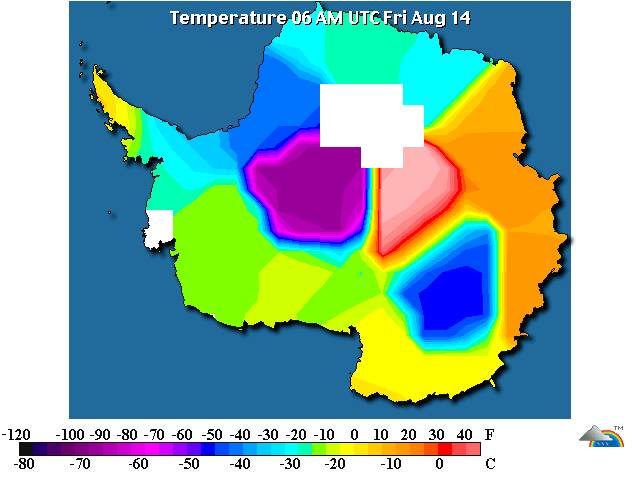 перелететь в нужное место, прикрываясь голограммой. После загрузки модуль перелетает на космодром. Наиболее подходящее место для космодрома - Антарктида. Какие резоны можно найти в пользу этой версии? Их достаточно: - это чрезвычайно закрытая территория, спутники над ней не летают; - разнообразные слухи о базе НЛО подо льдами Антарктиды и о входе в подземный мир полой Земли; - в Антарктиде побывала практически вся верхушка власти, что там делать, к примеру, зампреду Правительства РФ Сергею Иванову? - рядом находится ось вращения, при строительстве удобно соорудить и шахту космодрома; - температурные карты Антарктиды показывают огромные скачки температуры, вплоть до плюсовой, как на этой карте: