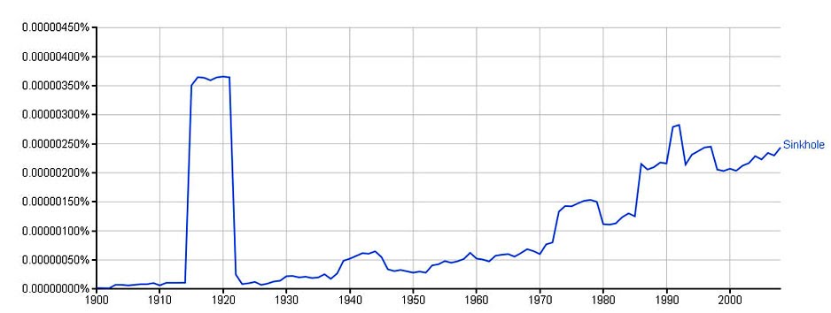 Таких воронок на Ямале уже много. Их называют воронками взрывного характера, типа, газ вырывается на свободу. Такое название вполне соответствует и округлости, и чистым стенкам. Но в других местах Земли газовых скоплений нет. А воронки такие же. Интересна статистика и по слову Sinkhole (карстовая воронка): Как я уже обращал внимание, в районе 1920 года были уничтожены все