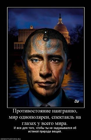 Статья "Аполлон-13 полетел к Луне?" так же ставит вопрос о том, зачем СССР покрывал американцев. Почему американцы пошли на фальсификацию, а СССР не опроверг? Лунохода-то тоже не было (недавно прошла информация, что его наконец-то нашли через 37 лет, анализируя последние снимки NASA, - он застрял в небольшом кратере), и американцы об этом знали! Отступление для тех, кто уверен, что СССР и США всегда воевали друг с другом. Я лично слышал от участника событий: две группы негров в Африке перестреливаются, одна под руководством советских инструкторов, вторая - американских; приказ с двух сторон: по белым не стрелять! Думаете, это случайность? В начале 90-х выплеснулось море неконтролируемой информации. Я видел такой сюжет: участник событий рассказывает, как Хрущев обыграл Кеннеди, - никаких ракет на Кубе не было, привезли деревянные макеты. Уверены, что Карибский кризис не спектакль двух актеров? А победа Оранжевой революции на Украине? США протолкнули своего ставленника, а закончилось всё повышением цен на газ - выиграла Россия. Кстати, проплачивал революцию бывший агент КГБ Березовский, а бывших, как все знают, там не бывает (обычно - двойные). По этому демотиватору видно, что о театре догадываются уже многие: А вот, что об этом думает обитатель лунного форума: