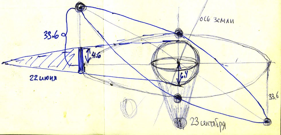Через сколько должно повториться затмение? Луна должна попасть в эту же полосу 12680 км. Длина орбиты Луны 384400*2*Pi = 2412000 км. Т.е. полоса составляет 12680/ 2412000=0.005 (1/200). Т.е. раз в 200 лет Луна окажется в нужном месте, чтобы произошло затмение (совпадение линии узлов с Линией - только возможность для реализации затмения, Луна еще должна быть полной). Это число, наверное, надо умножить на 10 (так как событие возможно в течение 34 дней из 365). Получается тот же сарос - 18 лет. Как интересно! Получается, что повторяемость затмений связана с радиусом орбиты Луны (и параметрами тени Земли) и не имеет отношения к повороту линии узлов.