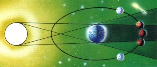 Можно оценить и количество затмений: диаметр теневого цилиндра в полтора раза больше, чем при лунном затмении. Т.е. и затмений за сарос должно быть в полтора раза больше.