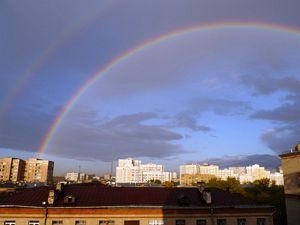 23.09.2009 вечером в Москве прошел небольшой дождик, и в небе повисла радуга. Да не простая, а двойная! После дождя воздух насыщен водяными капельками, которые преломляют (расщепляют) лучи солнца на семь отдельных лучиков разного цвета - это и есть радуга. А если лучи в капельках преломляются дважды, то появляются две радуги. Причем во второй цветные полосы расположены в обратном порядке. Не правда ли, замечательное объяснение: один раз преломившись (т.е. уже расщепившись), луч проделывает это вторично. А вот если солнца два, то второй раз преломляться и не надо. |