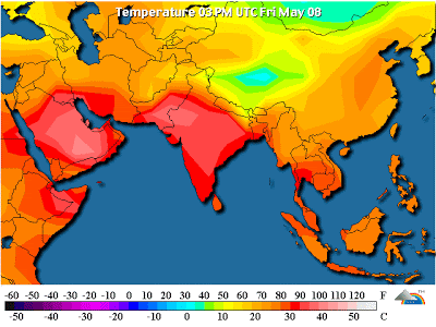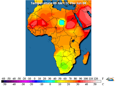Казалось бы, жара должна смещаться влево к западу Африки. Но она локализуется с центром южнее Персидского залива, а на северо-востоке Африки четко очерчена граница между двумя горячими областями: африканской и азиатской. Четко можно выделить 4 тепловых солнца: 2 африканских, аравийское и индийское. В Индонезии уже ночь и местное солнце уже "погасло" (кстати, Австралия всё лето задевалась тепловым солнцем лишь на северо-западе). Летом в Африке добавилось еще египетское солнце.
