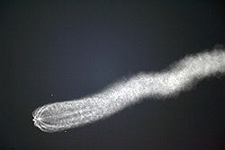 Подобные следы мы можем наблюдать за самолетами, когда они летят на высоких эшелонах. Атмосфера в значительной степени там устойчива, то есть этот след может наблюдаться в течение продолжительного времени, а не сразу рассеиваться. Там также выделяются тепло, влага, выделяются ядра конденсации, на которых оседает эта влага. Но это мы наблюдаем в дневные часы, а ночью при более мощном выделении тепла, при сгорании более мощного объекта это такое форму принимает.